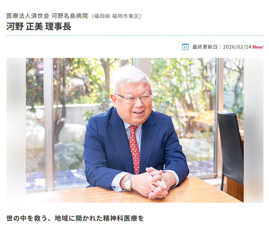このたび、全国の病院・総合病院・大学病院の総合情報サイト「ホスピタルズ・ファイル」へ当院をご紹介いただきました。河野名島病院、河野粕屋病院それぞれの特徴やこれまでの歩み、地域の皆さまに選ばれる病院となるための取り組みなどを、写真付きのインタビュー記事にてご紹介いただいております。詳しくはホスピタルズ・ファイルよりご覧ください。